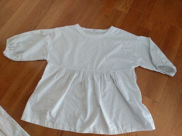 | 自分用のブラウスです。 先日作った水色チェックのワンピースの型紙をアレンジして、お尻までカバーしてくれる丈で作りました。 ギャザーは少なく。 後から思い付きで共布のリボンとベルトループを作りました。 ふんわりしたシルエットですが、ウエストを絞るとスタイルアップ! ストライプの柄も相まってオフィスにも着ていけそうなブラウスになりました。 |