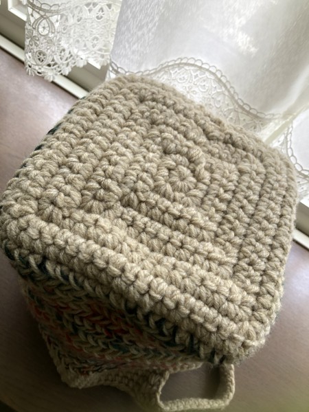 メランジのベージュとセリアで買ったカラフルな糸を引き揃えて、初めてヘリンボーンでバック編みました。