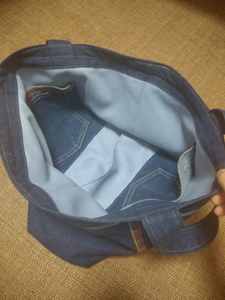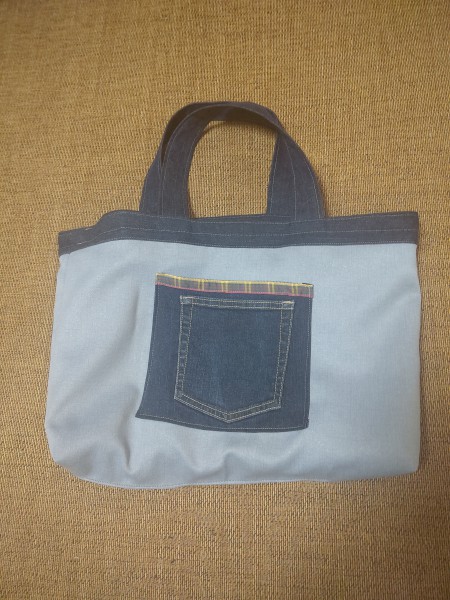 デニムの残りでトートバッグをとのリクエスト、ボケットを再利用しました。