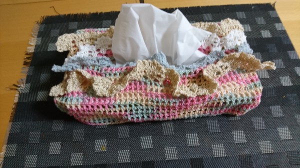 ダイソーの混ざりレース糸でティッシュケース編みました。フリルが好きなので そこが気にいっています。写真のサイズが大きすぎるとなって同じ写真しか載せれませんでした。