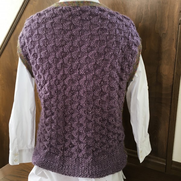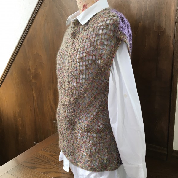 | 母の遺品のモヘアの糸で編んだベスト♪ 斜めに編んでいき、中心部がぐるぐると回っているように見える編み地です。 只、糸が足らなくなったので、表はかぎ針編みで、後ろは棒針編みで編みました。 なんか思ってた感じと違って、あまり良くないかも! 叔母にプレゼントするの迷ってます。 コサージュも2種類作りました。 |