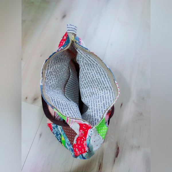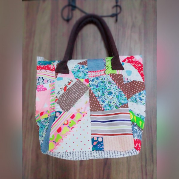 クレイジーキルトのバッグです。肩から掛けれるようにもう少し持ち手を長くしたら良かったと思いました。たくさん残っていたハギレが活用出来ました。
