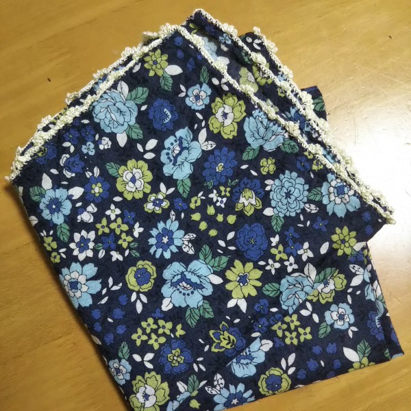 YUWAの布をハンカチに仕立てて縁編みをしました。前回のハンカチと縁編みの色を変えたので少し明るい印象に仕上がりました。