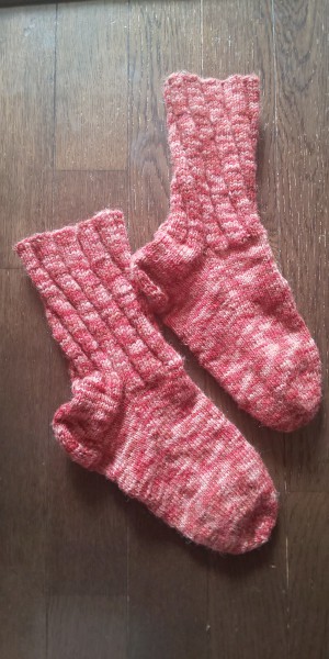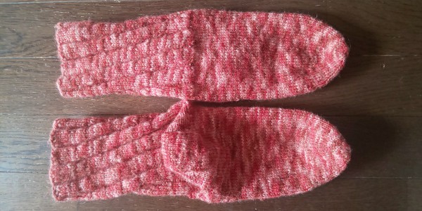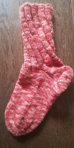 以前完成させたスパイラルソックスですが、手が緩かったせいか、しばらく履いていると伸びてくるのか、ダルダルと下がってきて、履き心地が良くなく、「ムキー!」って感じでほどき始めてしまいました。