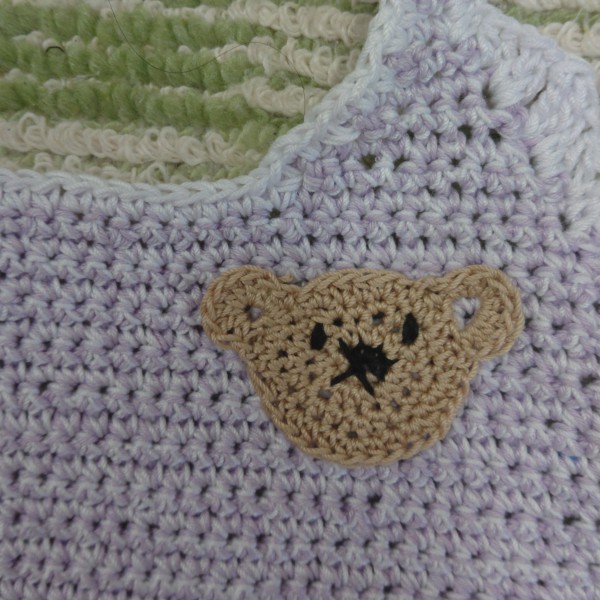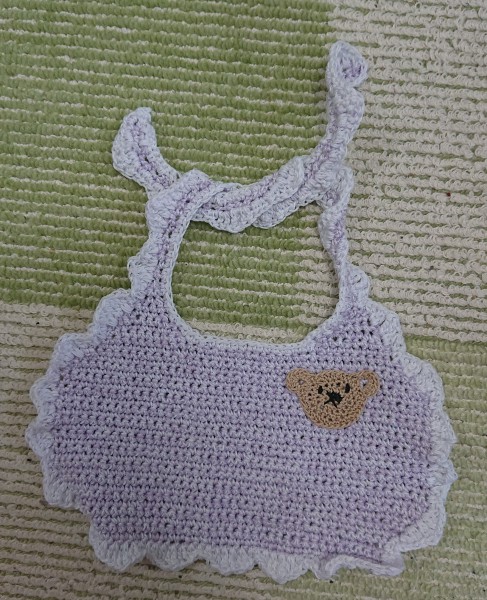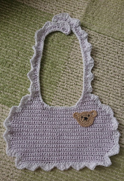 お食い初め用にスタイ(よだれかけ)を編みたいと思い立ち、YouTube動画を参考に目数や使う糸をアレンジしました。くまのモチーフもレースで編み、布用ボンドで接着しました。