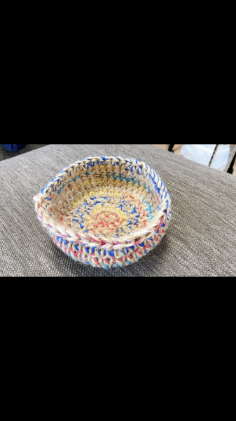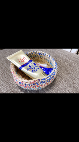 麻紐とカラフルな毛糸を合わせて編んでます。