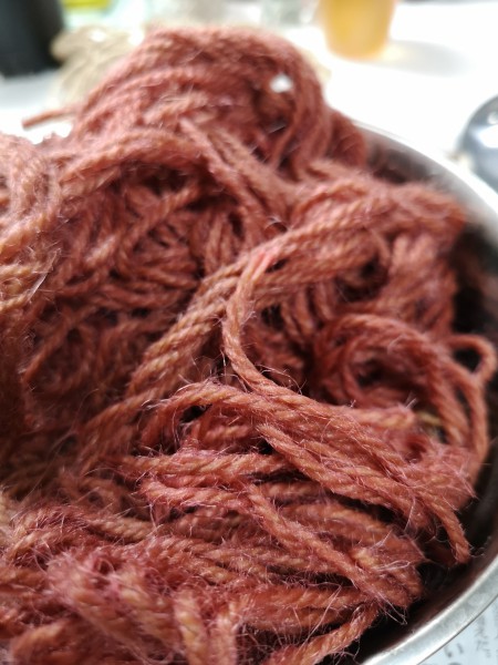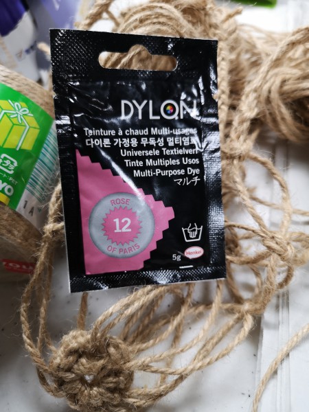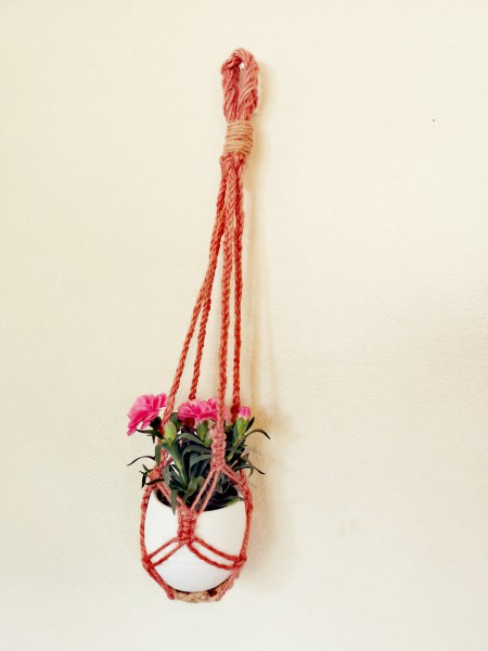 麻紐を染めてマクラメにしました。壁掛けでも置きでも楽しめる用に底は鍵編みで安定させています。