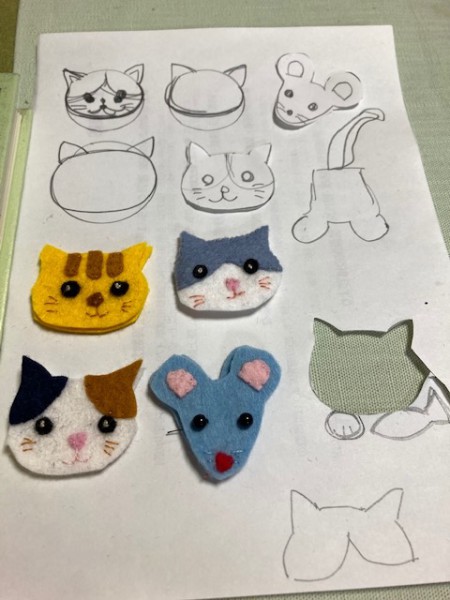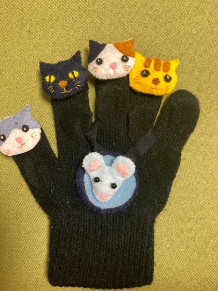 「一丁目のどら猫」の手遊び歌に合わせて、猫やネズミを手袋につけたりはずしたりできるようにしました。リトミックのレッスンの中で使いたいというリクエストに応えて作ったものです。