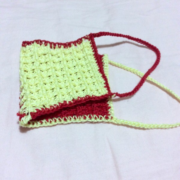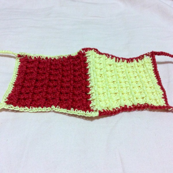 | コットンのレース糸で、かぎ針編みのマスクを作りました。 ワッフル編みでポコポコした編み地になっています。耳にかける紐もレース糸です。 黄色が残り少なかったので、同じ太さの赤い糸を使いました。 あまりにも派手すぎて悪目立ちしそうで、外にはつけていけない…というか、これ一枚では感染対策にならないので、どっちにしろ外ではつけられないのですが。練習だからいいのです(^_^;) |
