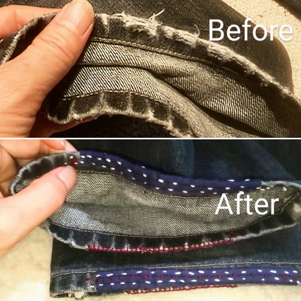 すり切れたジーンズの裾を、ダーニングでチクチク。