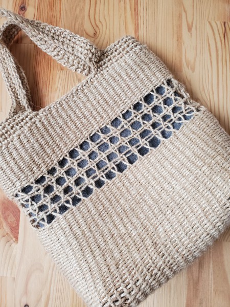 持ち手をこまあみで編みました あとはポケット付きの内布をつけます