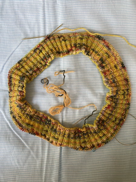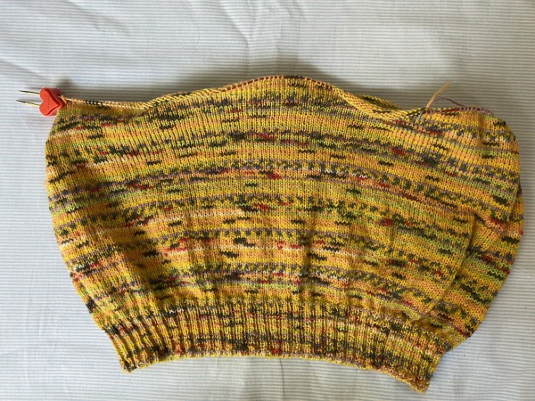 ここから先は身頃と合わせて編み進むために袖は一旦お休みします。