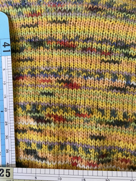 一旦ここで縦ゲージを数えてみたら、編み図のゲージと全然違うことに気が付きました。まあ、横ゲージだけ合ったことを確認してスタートしていたので想定内です。