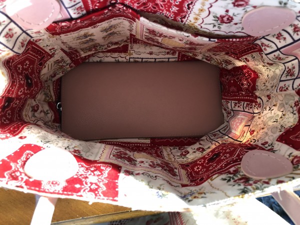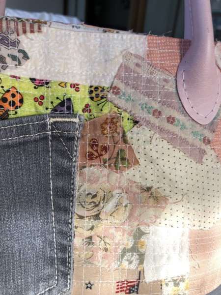 着古したジーンズと、パッチワークで出たクズ布でトートバッグを作りました。