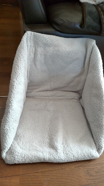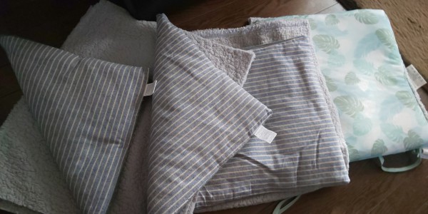 | 過去作品 腰を包むクッション 座面はハニカム座布団を使うので、厚みはあまりいらないが、事務用椅子の腰回りがスースーするのをなんとかしたいので、100均の座布団4枚とホームセンターの養生毛布ダブルサイズ500円位(新品)で作成しました。 |