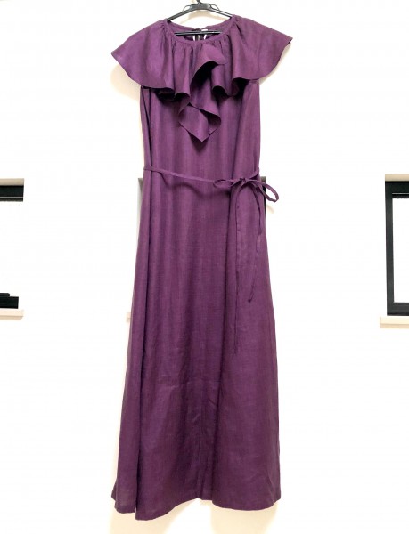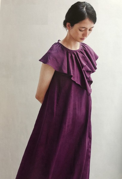 胸元のフレアがきれいに出るように、ケープカラーを立体裁断しています。身頃はノースリーブのシンプルなワンピースです。