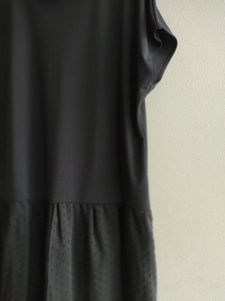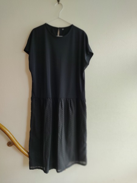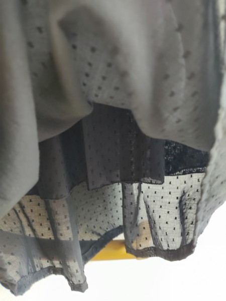 透け感のあるドットのコットンにギャザーを寄せてユ○ク○のトップスに縫い付けただけです。透けるので2枚合わせにしました。ものの1時間でなんちゃってワンピースの出来上がり!