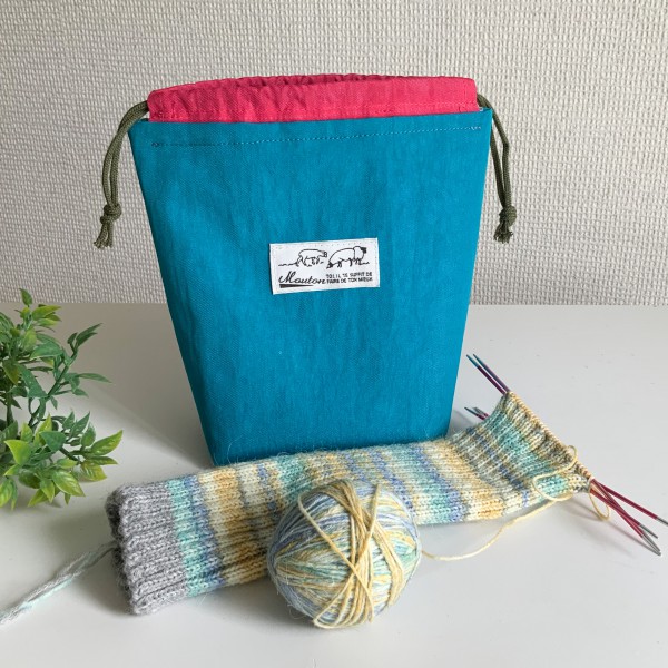 しっかりした生地なので巾着は口を絞るのがキツく、ファスナーの方が使いやすそうです。小物をいつも持ち歩いては待ち時間に編んでいます。