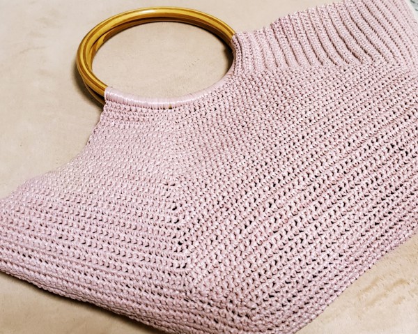 編み図よりちょっと大きめにした。 そしてハンドル周りにパールを縫い付けました♪