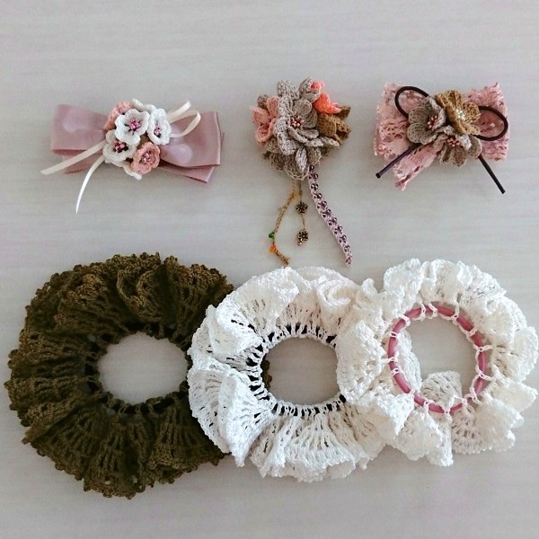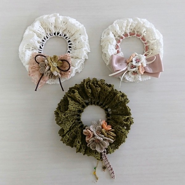 3つのシュシュを大きさを変えて編みました。
