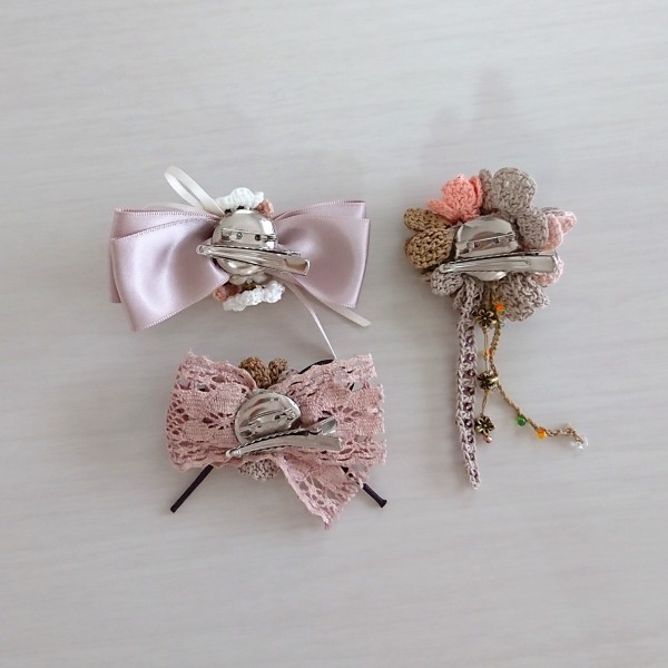 お花はシュシュに合わせたり、単独でヘアピン、ブローチとしても使えるように2Wayピンを使いました。