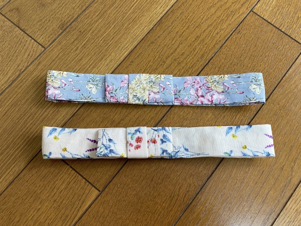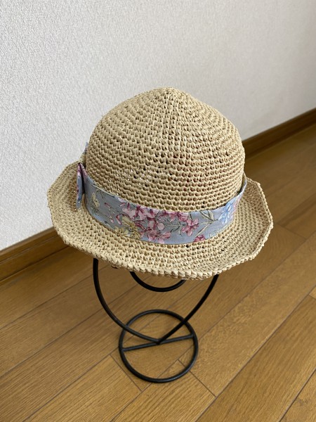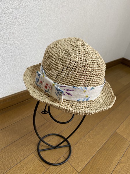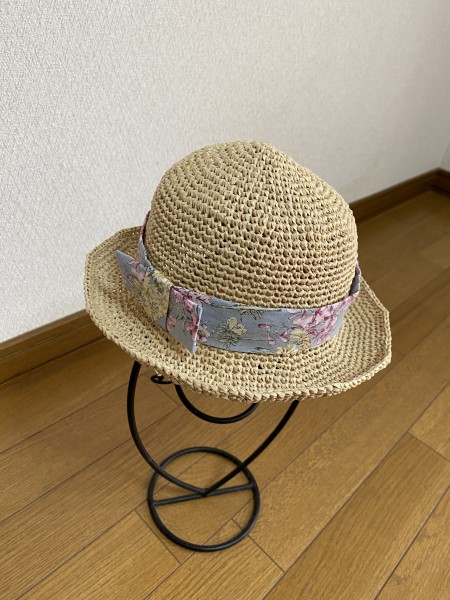 孫の麦わら帽子。リボンは孫の洋服を作った生地で作る事にしました。リボンの幅、形、大きさは娘と相談しながら作りました。