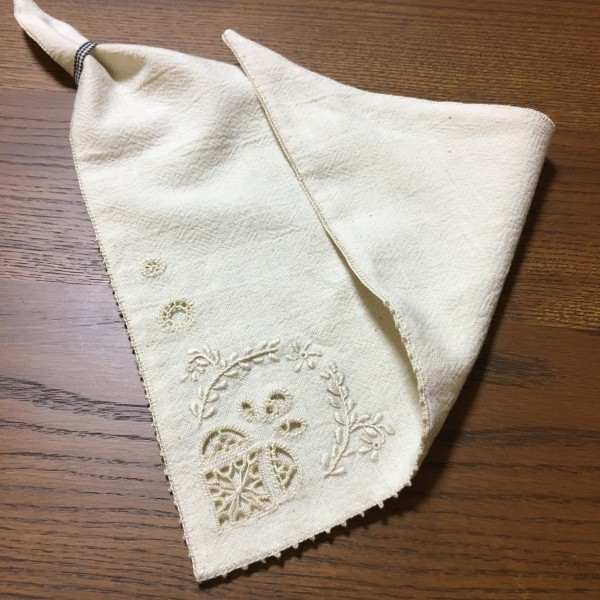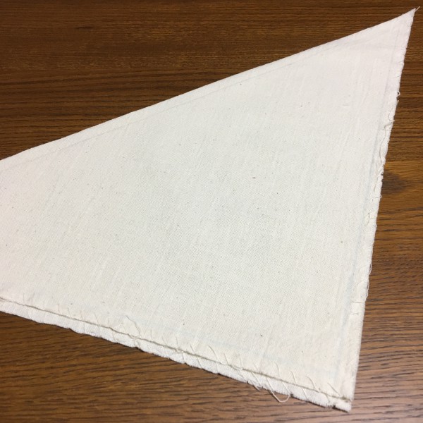 布を三角に折るだけでぴったりサイズ!だけど、装着時に布通すための輪っかを作る分がないので、適当に手元にあったギンガムチェックのリボンをつけて完成ということで!