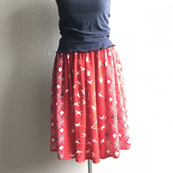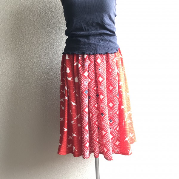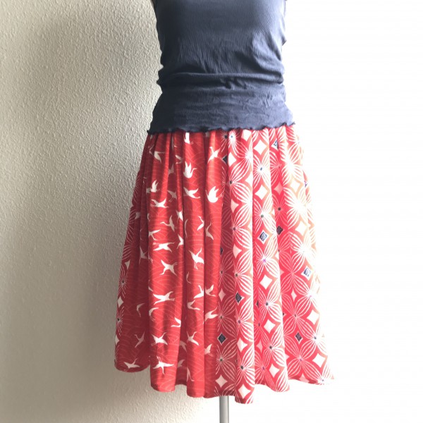 手持ちの布を整理したら、和布が発掘されたので、2種類の柄を交互に接いで、ウエストゴムのギャザーを制作しました。