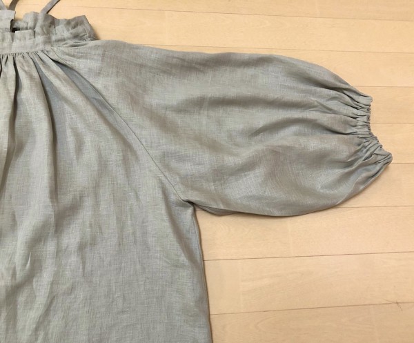 後ろリボンの、ふわっとしたボリュームのあるブラウスです。ギャザーがきれいに出る生地を選んで下さい。襟が難しいので、襟だけ試し縫いをしてから作るとキレイに出来ますよ。