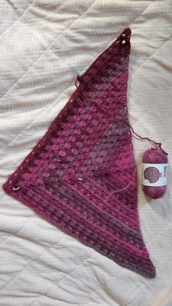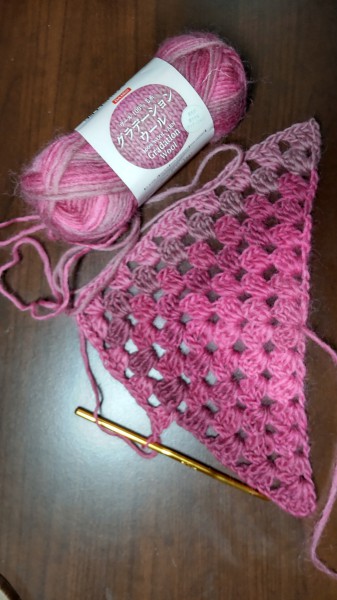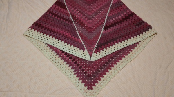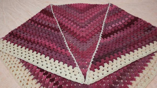 | かぎ針編みの三角ショール 糸が難ありで大変でしたが、無事糸を使い切れたのと、これからの季節、首肩の冷えに活躍してくれそうです。  |
