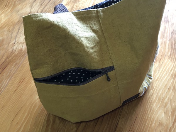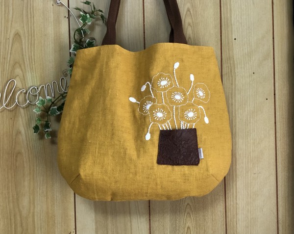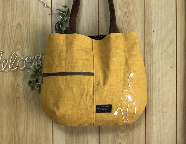 両面にポピーの刺繍、ファスナーポケットつけました。