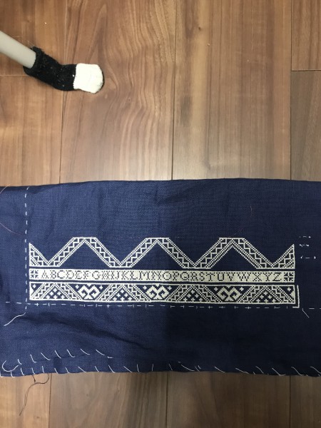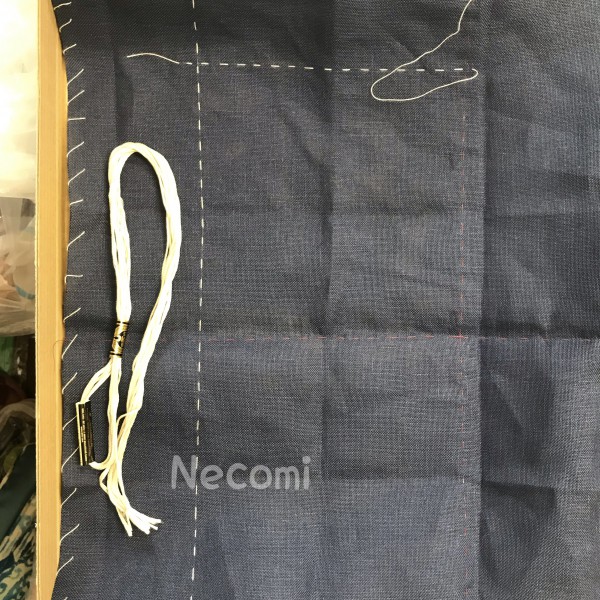 ちょうどネイビーのリネンと指定色の糸があったので、活用。 32ct、DMC刺繍糸822番