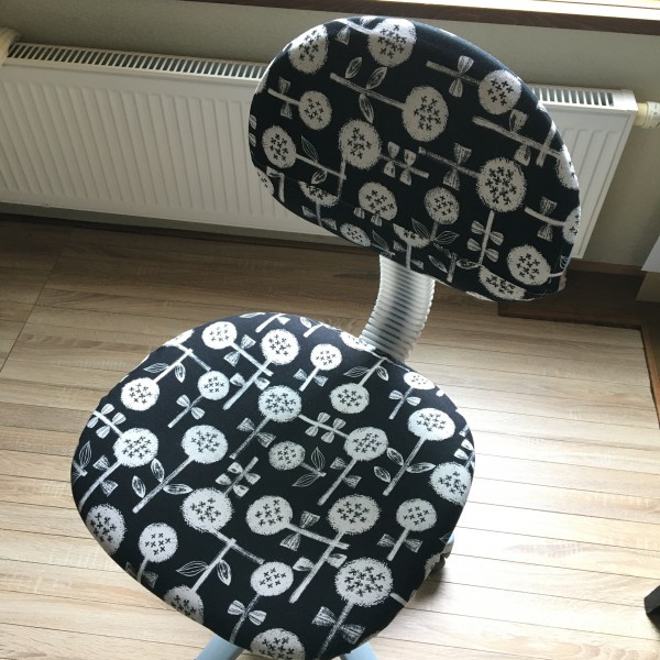 子どもの学習椅子をミシン用に使っているのですが、座面が擦れて来たので余り布でカバー縫いました。ツギハギでギリできました。笑っちゃいますが気分良く座れます〜