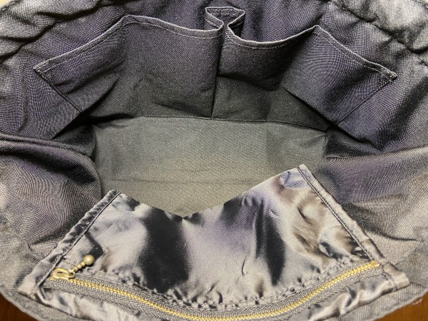 トートバッグを裏返しにして、外ポケットを内ポケットとして使えるようにし、ファスナーをつけたポケットを取り付けて、入り口を閉じることができるようにホックも付け替えました。入り口を縫い合わせました。この後、持ち手をつけて完成にする予定です。