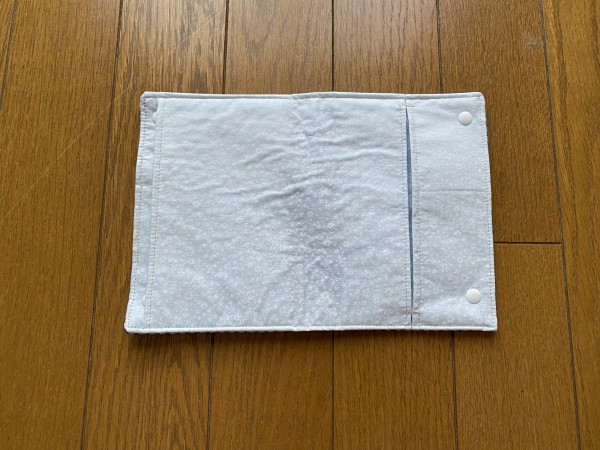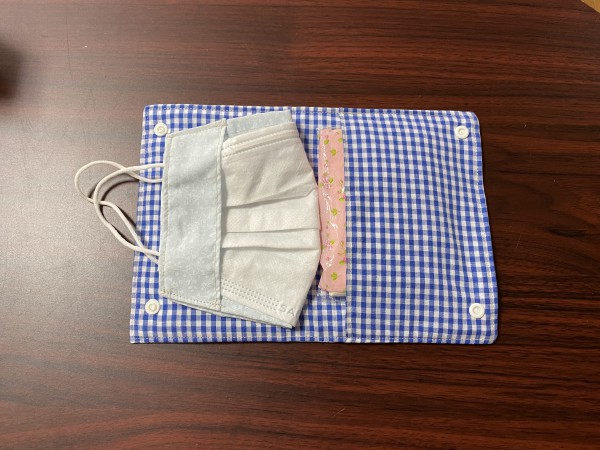 大きくなりすぎず、ティッシュや予備のマスク、小物が入れられるように作りました。表は一枚布で折り畳んでます。