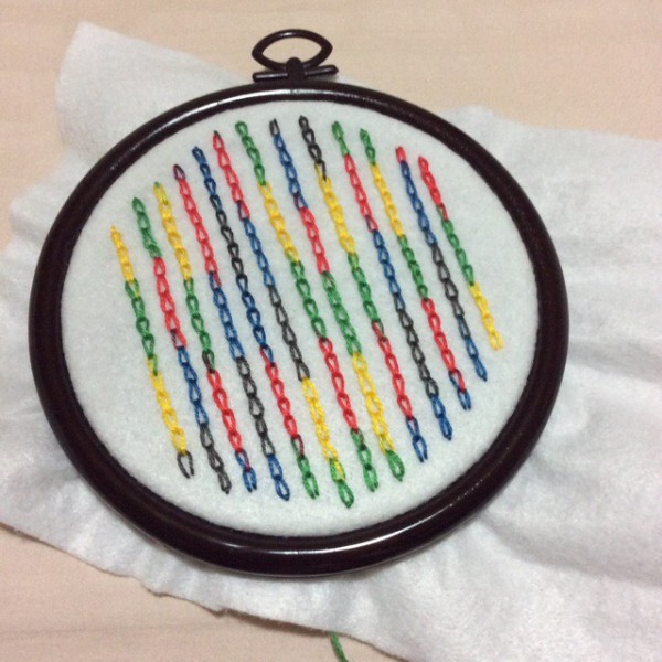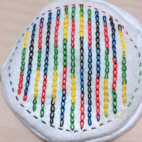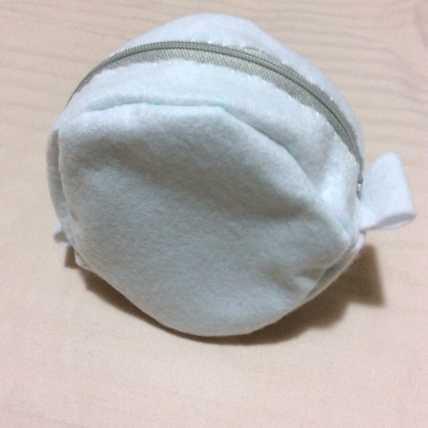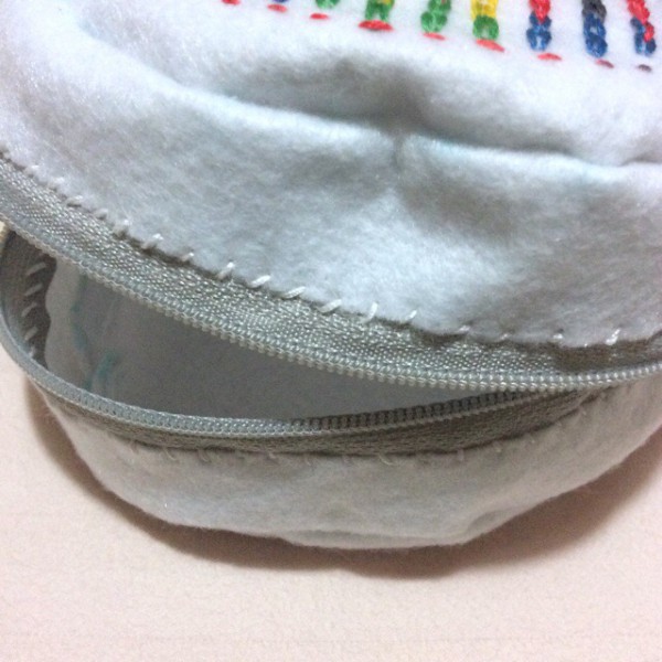 | 片面に刺しゅうをした、丸い形のファスナーポーチを作りました。 白いフェルトに、一本で色が変わっていく刺繍糸でチェーンステッチの模様をつけました。 ファスナーは、まつり縫い?でつけました。裏地はないのでフニャフニャです(^_^;) マチなしでもいいかな?と思ったんですが、ファスナーを丸くつけるのが難しそうだったので、マチをつけました。 |