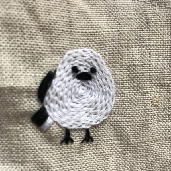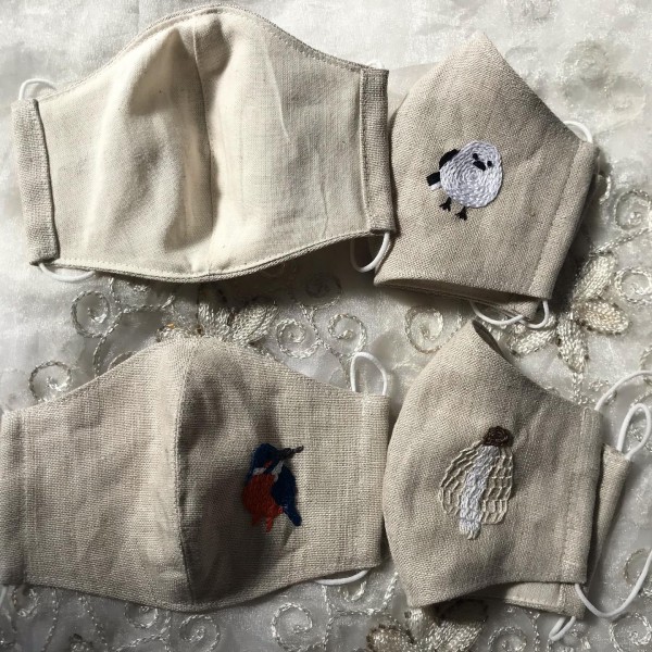 シマエナガ刺繍のリネンマスクをリクエストいただいたので、シマエナガ・枝に止まるシマエナガたち・キヌガサタケ・カワセミ刺繍のリネン立体マスクを制作しました。