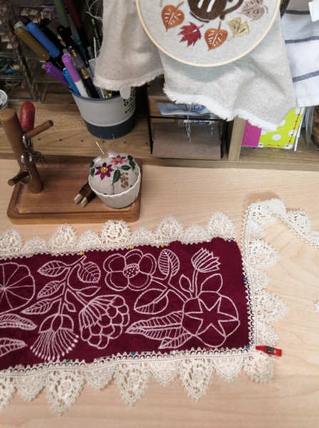 直線で縫うと布の歪みが目立ちそうだなと悩んでいたので、レースだと手縫いで自然に縫いつけられそうですね(◍•ᴗ•◍)*。