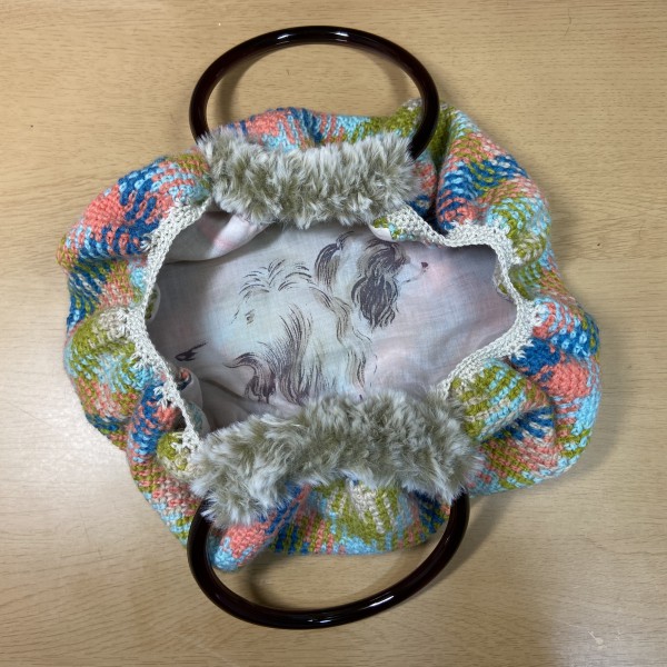 | 半年ぐらい前にYouTubeちゃんえぬさんの動画を参考に作ったプランドプーリングの丸ハンドルバッグです。もう少しファーをフワフワさせたかったのですが、、、内袋には犬がデザインされたハンカチを使いました。オレンジがちょっとだけハロウィンぽいかなと思って引き出しからだしてきました。初プランドプーリングでしたが、編み進めるとチェック模様が出てくるので編んでてとっても楽しかったです。 | |