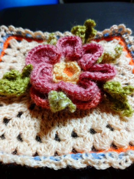 土台とフラワーに分けて編み、最後にとじ付けました。