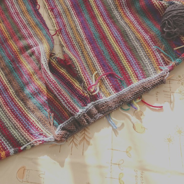 身頃は増減なしで編むつもりでしたが、気が変わって肩下がり、衿下がりをつけました。