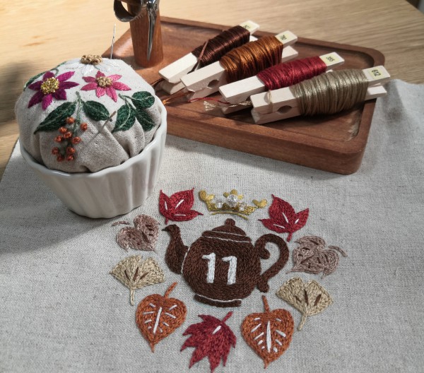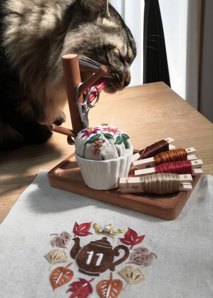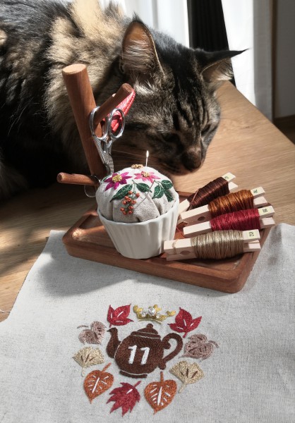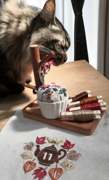 刺繍工房Sayan 4年 chakuさん!コメントありがとうございます(◍•ᴗ•◍) あっという間に11月ですねー。秋も段々と冬になってしまうので、今のうちに秋色を楽しみたいですね( •͈ᴗ•͈) 写真撮ってるとすぐにチェックしに来る猫です。糸でいたずらしそうですぐ片付けました(笑)