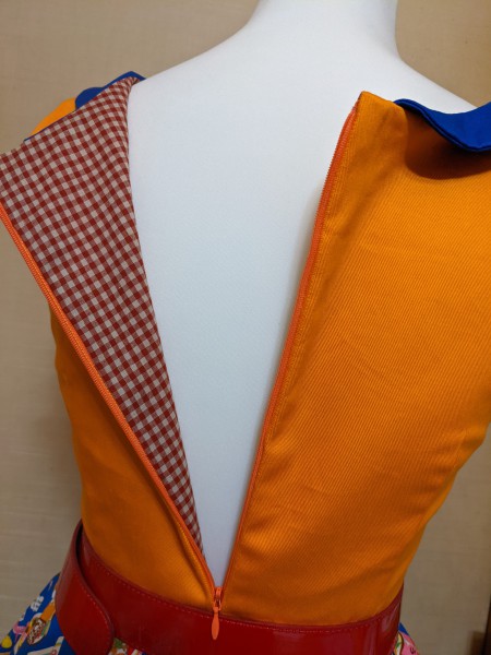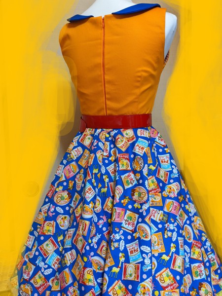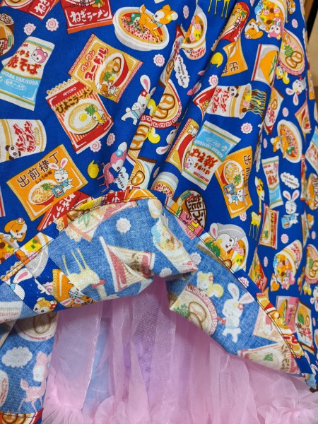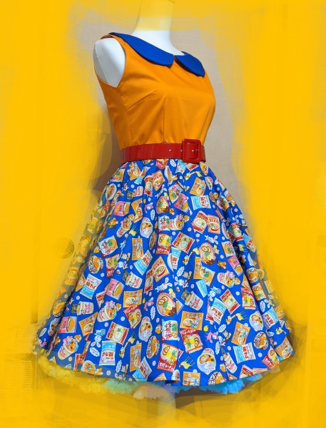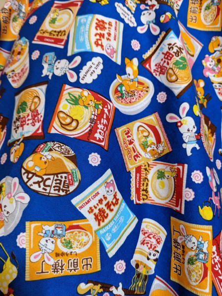 | 大好きなラーメンとレトロ可愛いキャラクターの生地に一目惚れして購入〜❗ 特に青色の色目が気に入りました。ラーメン柄の中の一色を上身頃にもってきたかったので柄の中で1番目立っていたオレンジにしました。下のスカート柄がわちゃわちゃしてるので、上は襟も含めシンプルに無地にしました。 友達に作ったパステルカラーのものとは違ってハッキリした色目のサーキュラーワンピースが出来上がりました。自分用です。 いつもは裾をバイアステープで仕上げるのですが、製作時間があまりなかったので三つ折りで仕上げました。 |