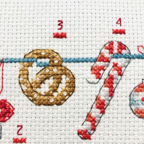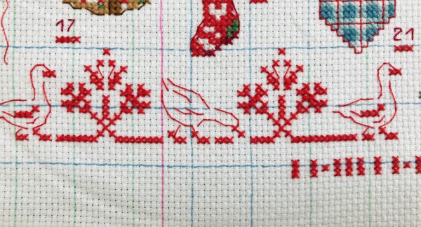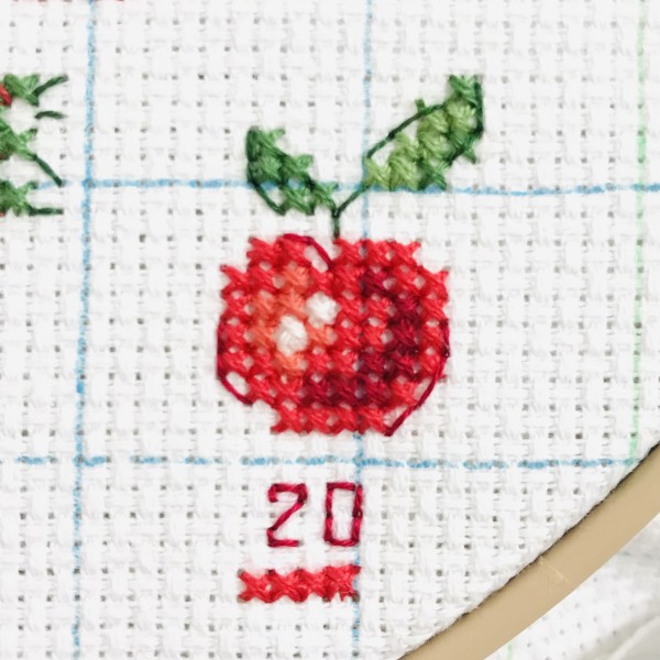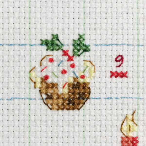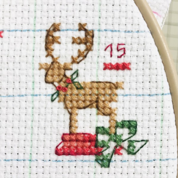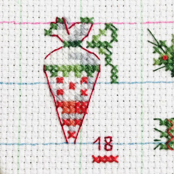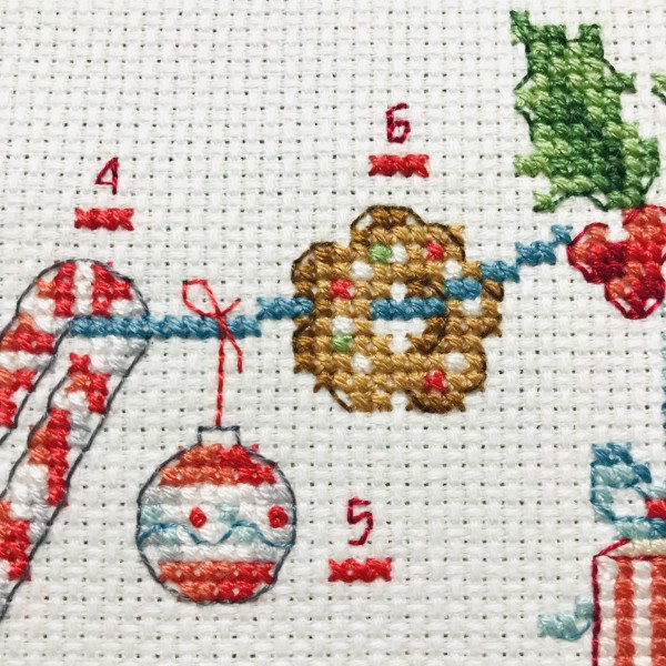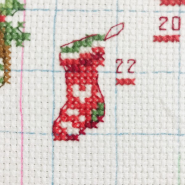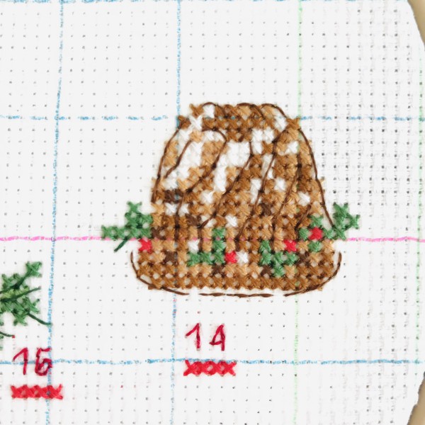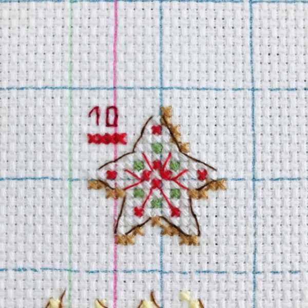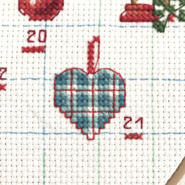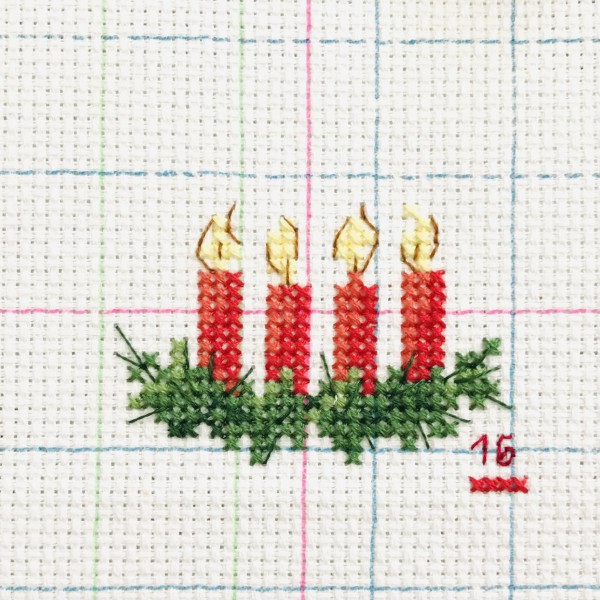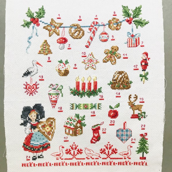 | ヴェロニク・アンジャンジェ著「フランス12か月の行事と遊びのクロスステッチ 」より クリスマス 刺繍した後に接着芯を貼り、裏布を付けました。 刺繍面の周りに金色の紐を縫い付けています。 アドベントカレンダーになっていて、小さなモチーフが24個あります。 |