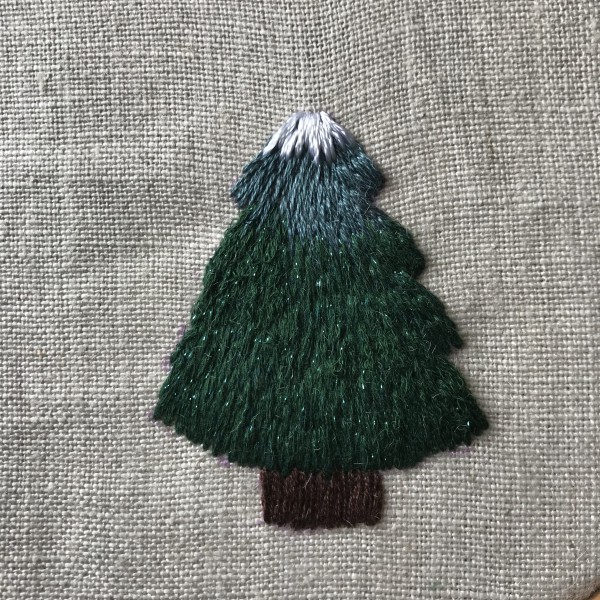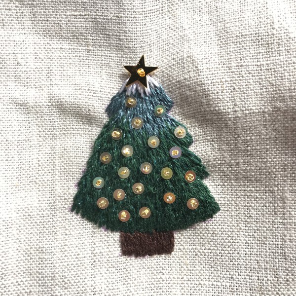 ロングアンドショートステッチでもみの木を刺繍し、スパングルでおめかししました。