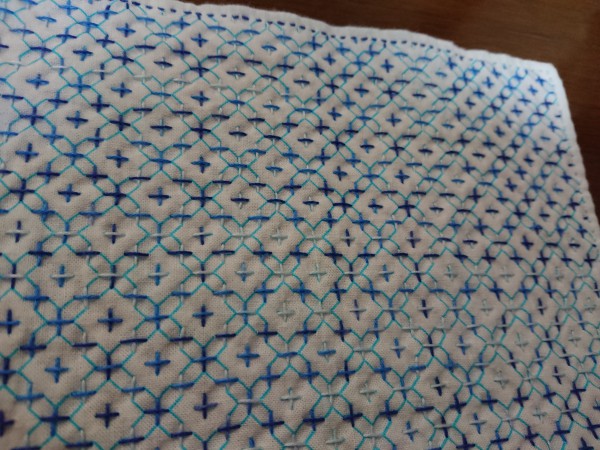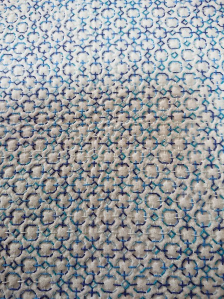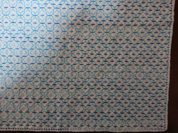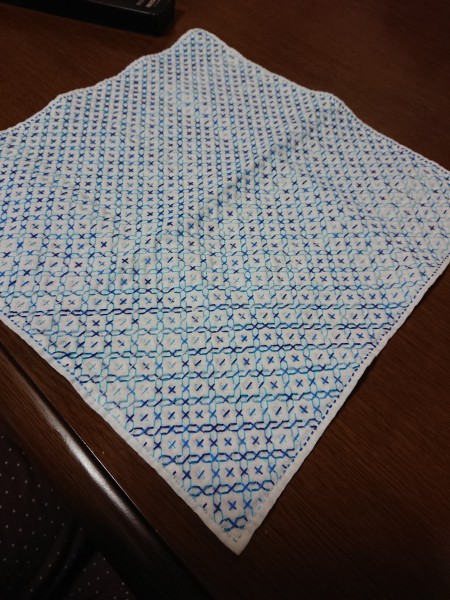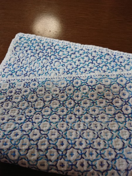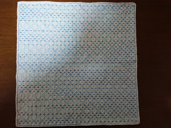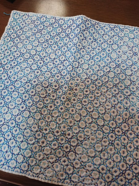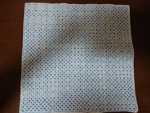 | 6枚目 十字花刺し 青グラデーション糸 コロナ禍で、刺し子が進むどころか、日中大騒ぎのこどもたちにペースを乱されて、まったくできなくて。 チマチマと少しずつやっていました。 |