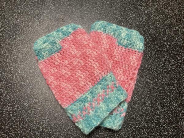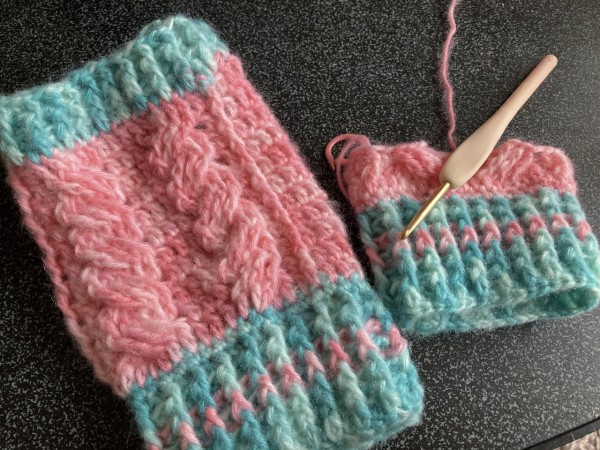 大人用なので、ホントはもう少し落ち着いた色の糸で編もうと思ったんだけど、とりあえず余り糸で試し編み…と思って編んだのを見せたら「これでいい!」とOK貰ったのでそのまま完成(笑)