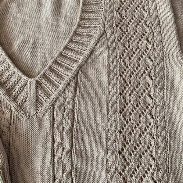 | コットン糸で編んだセーターです。あまり寒くなってからでは着られないので、あせって編みました。着丈が約66㎝と少し長めです。 前後身ごろを肩で綴じて、身ごろから直接 目を拾って袖を編みました。袖口と裾は二目ゴム編みを綴じ針でとめてあります。襟ぐりは3目2目のゴム編みで綴じは かぎ針で引抜き編みを2周してあります。 |