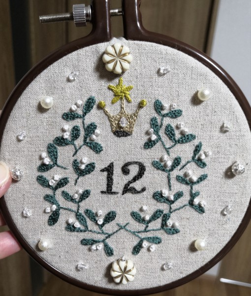 樋口愉美子季節のステッチより12月のマンスリーエンブレム ヤドリギ
