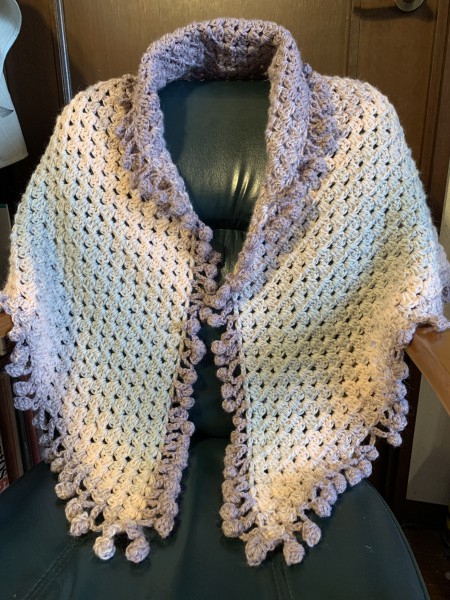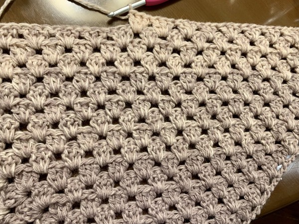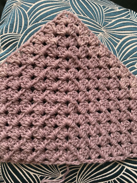 22段目途中で淡いピンク一色になりました。ラベンダーの混ざった部分は68グラム(約45%)、三角形の高さ35㎝まで編めました。